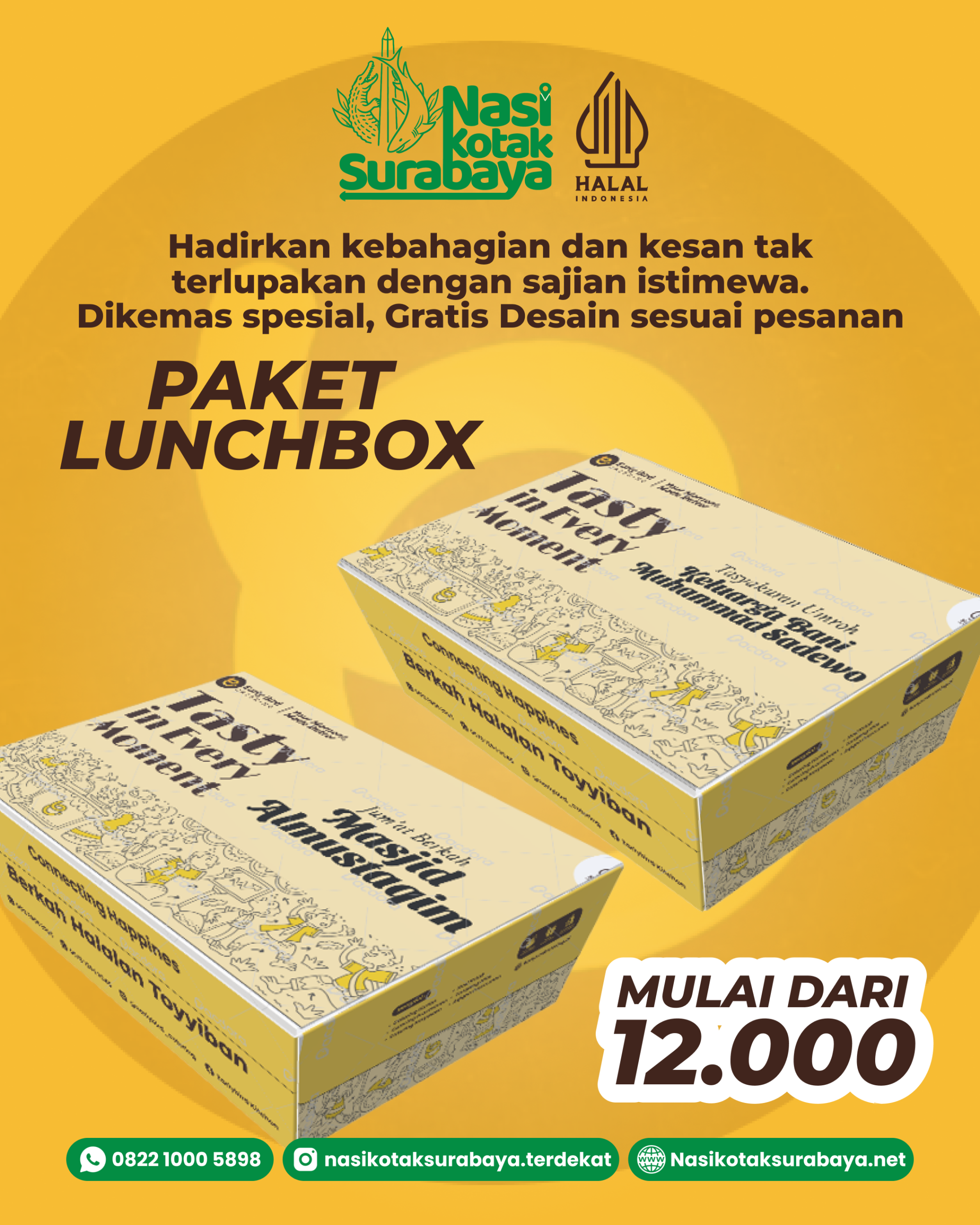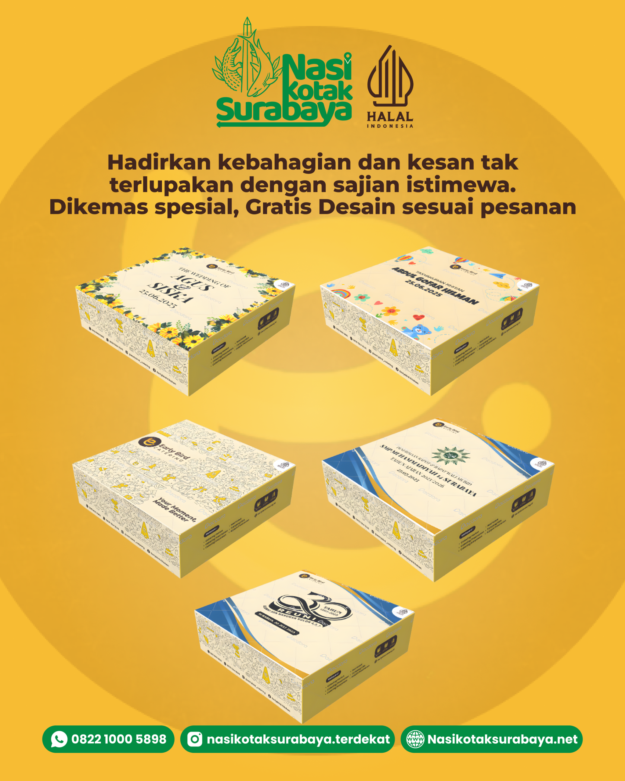 Pesan nasi kotak untuk rapat kantor, syukuran, tahlilan, event sekolah, hingga acara keluarga. Menu lengkap, bisa custom, dan pengiriman cepat area Surabaya dan sekitarnya.